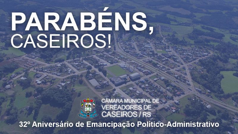 Com satisfação e orgulho a Câmara Municipal de Vereadores Parabeniza Caseiros pelos seus 32 anos de história, trabalho e desenvolvimento. Este dia 09 de maio é muito mais do que um marco na vida de qualquer cidadão, é sim, uma página que viramos para conquistar novos sonhos, novas realizações e continuar escrevendo nossa historia. Neste ano não vamos comemorar como gostaríamos e como nosso município merece, mas estamos unidos em prol do bem comum. Desejamos que cada munícipe seja um ponto de apoio nesta construção diária semeando ações e colhendo conquistas. Temos orgulho de ser caseirenses, como legisladores, queremos acima de tudo, fazer de nosso município um lugar melhor e mais saudável para todos. A Ele nossa gratidão e o desejo de progresso e desenvolvimento. Que as conquistas sejam sempre crescentes, Parabens Caseiros!